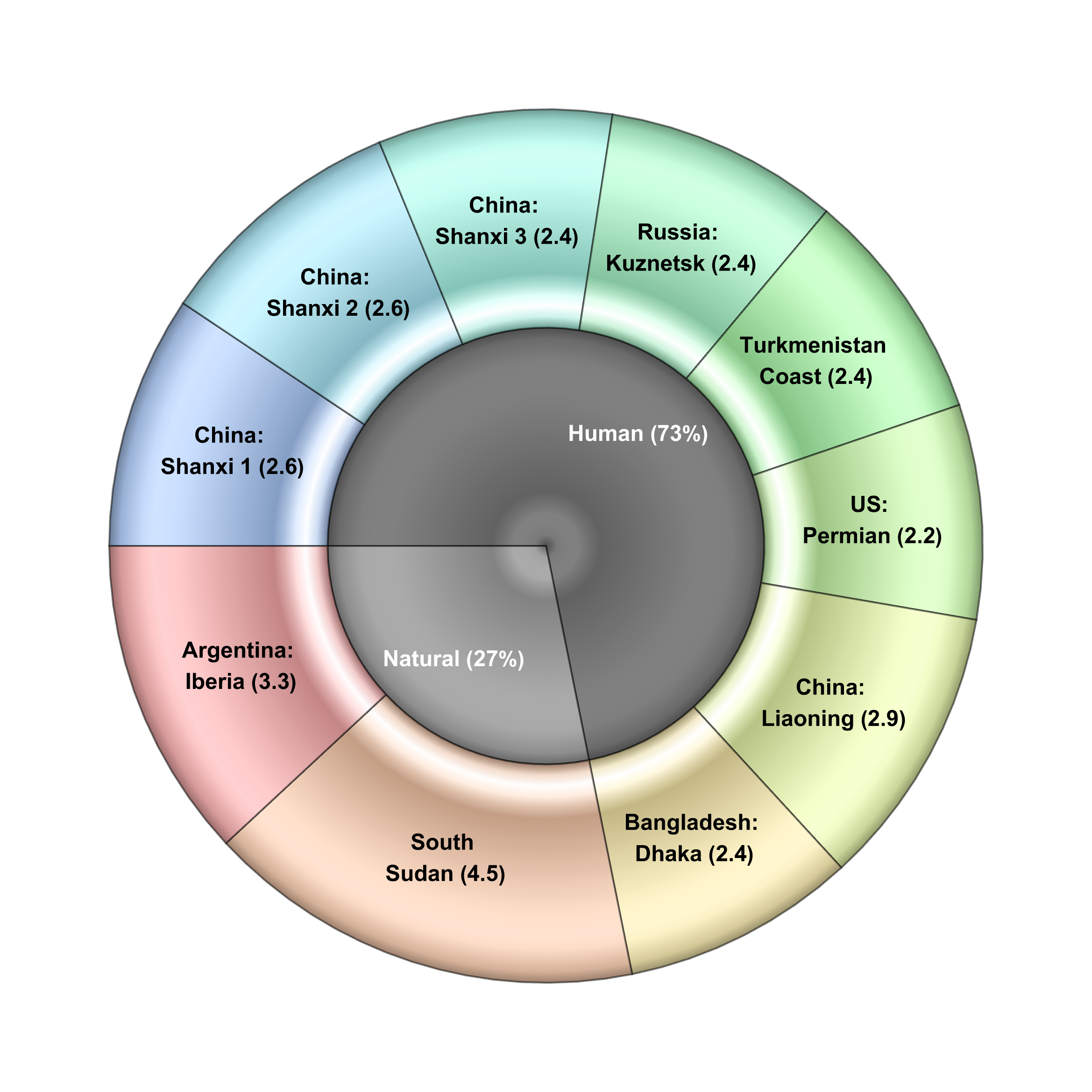The Sentinel data was gathered from 2018 to 2021, and then turned into per-region annual emissions for comparison.1 Together, all these sources release about 28 megatonnes of methane a year. In 2021, total global methane emissions were about 580 megatonnes.7