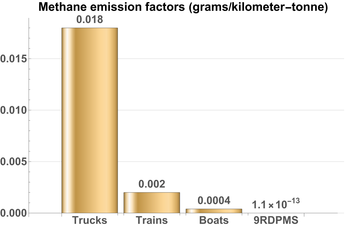 A handy way to compare the emissions of different ways of moving stuff around is to use a "freight emissions factor" chart. The US EPA does a great job of compiling these at its GHG Emission Factors Hub.10 Methane efficiency is measured grams of methane per tonne-kilometer.